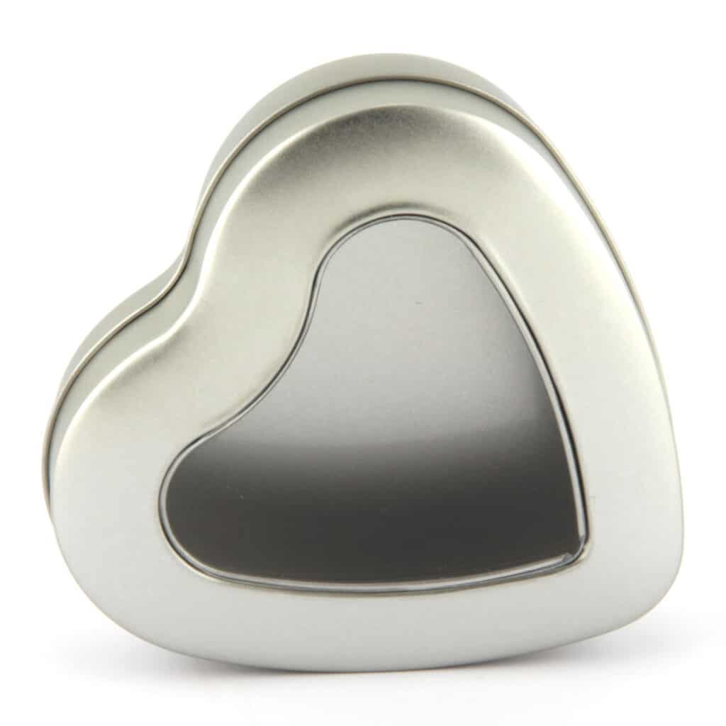 Prachtig, matzilverkleurig, hartvormig (thee)blikje met venster. Leuk om een gedecoreerde thee zoals Liefs of Knuffel in te verpakken.