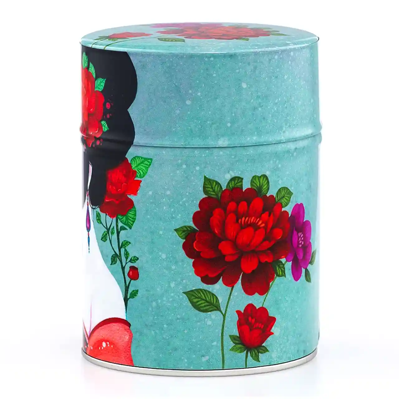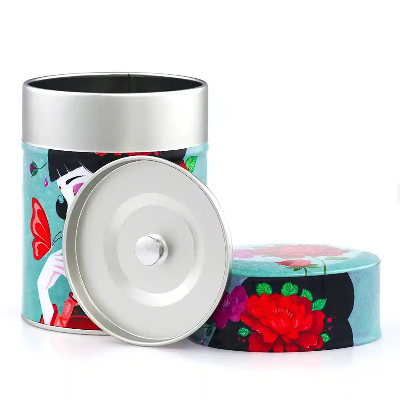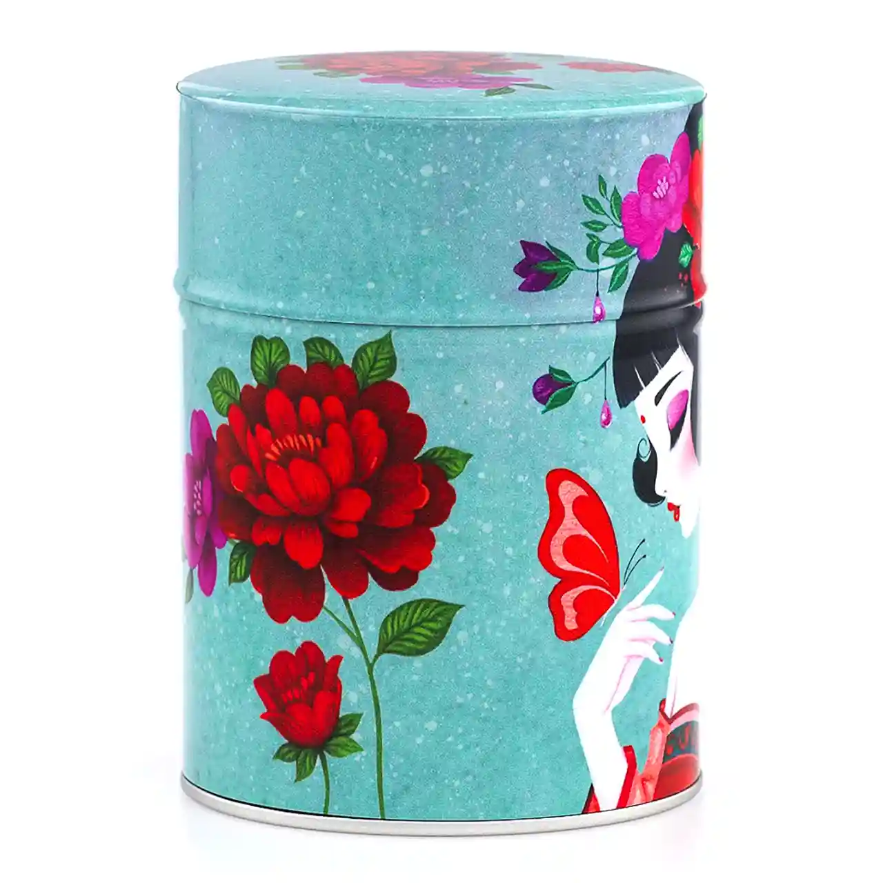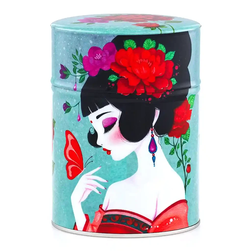 De theeblikken van Esprit Celadon die wij verkopen hebben allemaal dezelfde basis: een cilindervormig blik van 115 mm x Ø 83 mm met een dubbele deksel. Dat basisblik is door de Franse producent met veel aandacht voor detail voorzien van een washi papier of polymeer behangetje met een mooie print er op. De print loopt door op de zijkant van de overschuifdeksel. De bovenkant van deze deksel heeft om technische redenen een eigen uitsnede van de print, maar die hebben ze wel zoveel mogelijk in stijl doorgevoerd, zoals je op de foto’s kunt zien. Onder de overschuifdeksel bevindt zich de binnendeksel met een knopje, die de thee extra beschermt tegen invloeden van buitenaf.
