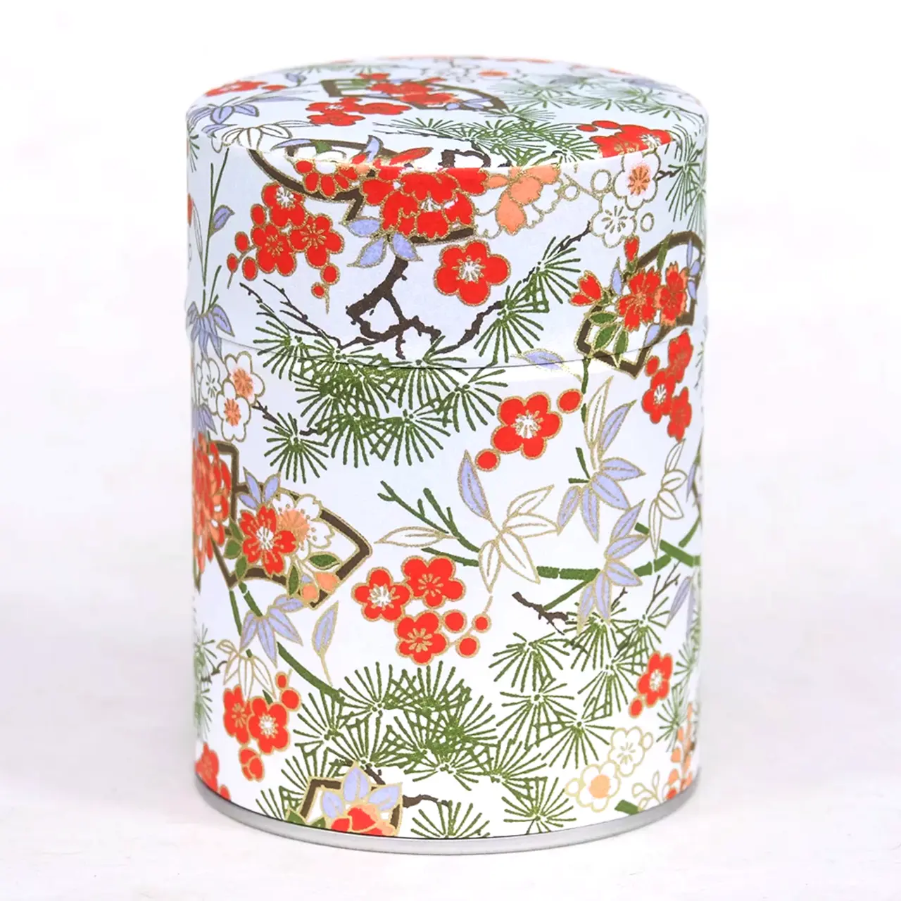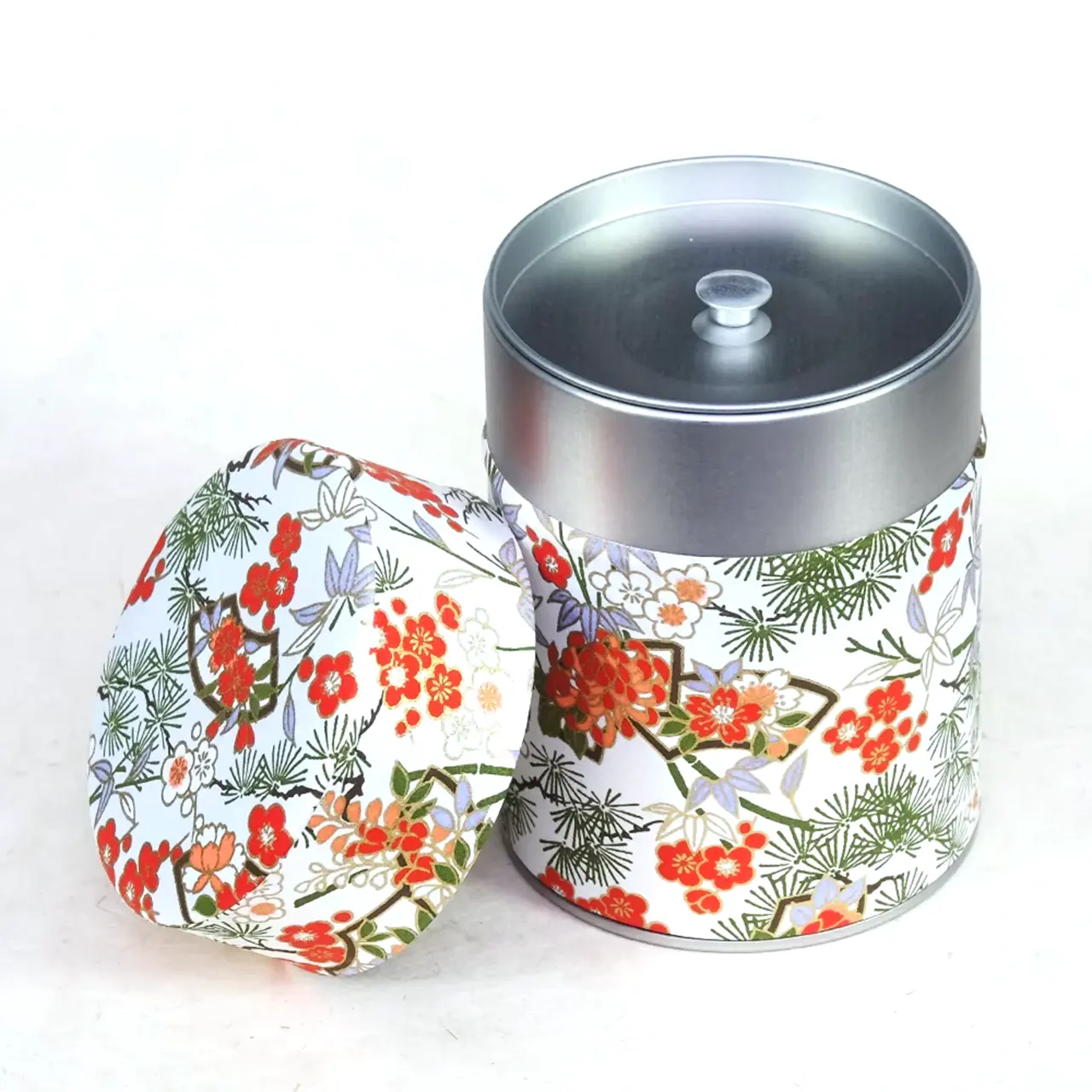 De theeblikken van Esprit Celadon die wij verkopen hebben allemaal dezelfde basis: een cilindervormig blik van 115 mm x Ø 83 mm met een dubbele deksel. Dat basisblik is door de Franse producent met veel aandacht voor detail voorzien van een washi papier of polymeer behangetje met een mooie print er op. De print loopt door op de zijkant van de overschuifdeksel. De bovenkant van deze deksel heeft om technische redenen een eigen uitsnede van de print, maar die hebben ze wel zoveel mogelijk in stijl doorgevoerd, zoals je op de foto’s kunt zien. Onder de overschuifdeksel bevindt zich de binnendeksel met een knopje, die de thee extra beschermt tegen invloeden van buitenaf.