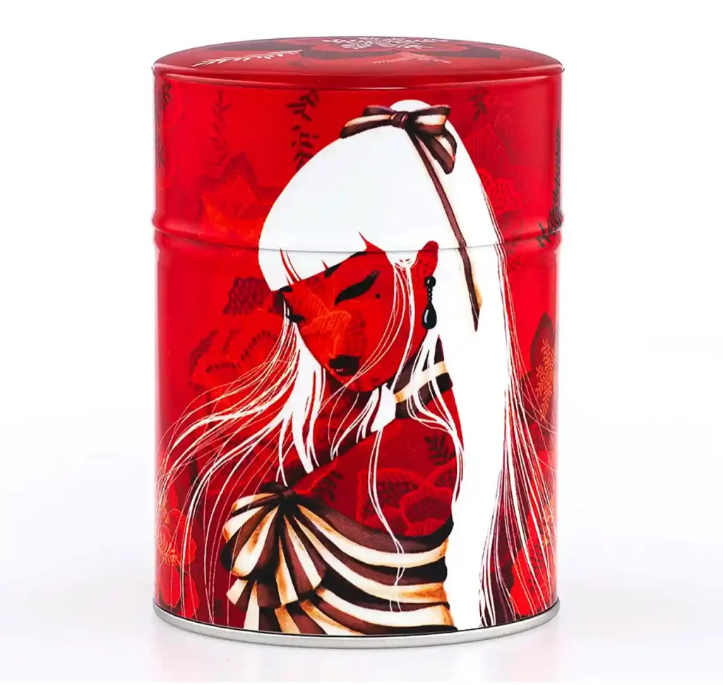 Theeblik van Esprit Céladon voorzien van een polymeerfolie met daarop een stijlvolle rode print met een moderne Japanse vrouw en bloemmotieven in warme tinten: Honoka.