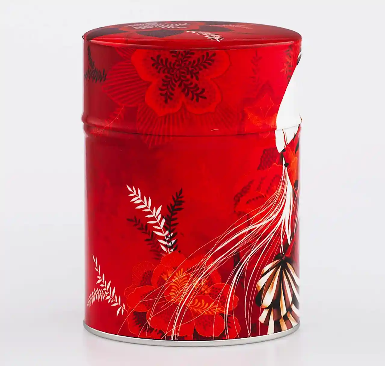 De theeblikken van Esprit Celadon die wij verkopen hebben allemaal dezelfde basis: een cilindervormig blik van 115 mm x Ø 83 mm met een dubbele deksel. Dat  basisblik is door de Franse producent met veel aandacht voor detail voorzien van een washi papier of polymeer behangetje met een mooie print er op. De print loopt door op de zijkant van de overschuifdeksel. De bovenkant van deze deksel heeft om technische redenen een eigen uitsnede van de print, maar die hebben ze wel zoveel mogelijk in stijl doorgevoerd, zoals je op de foto’s kunt zien. Onder de overschuifdeksel bevindt zich de binnendeksel  met een knopje, die de thee extra beschermt tegen invloeden van buitenaf.