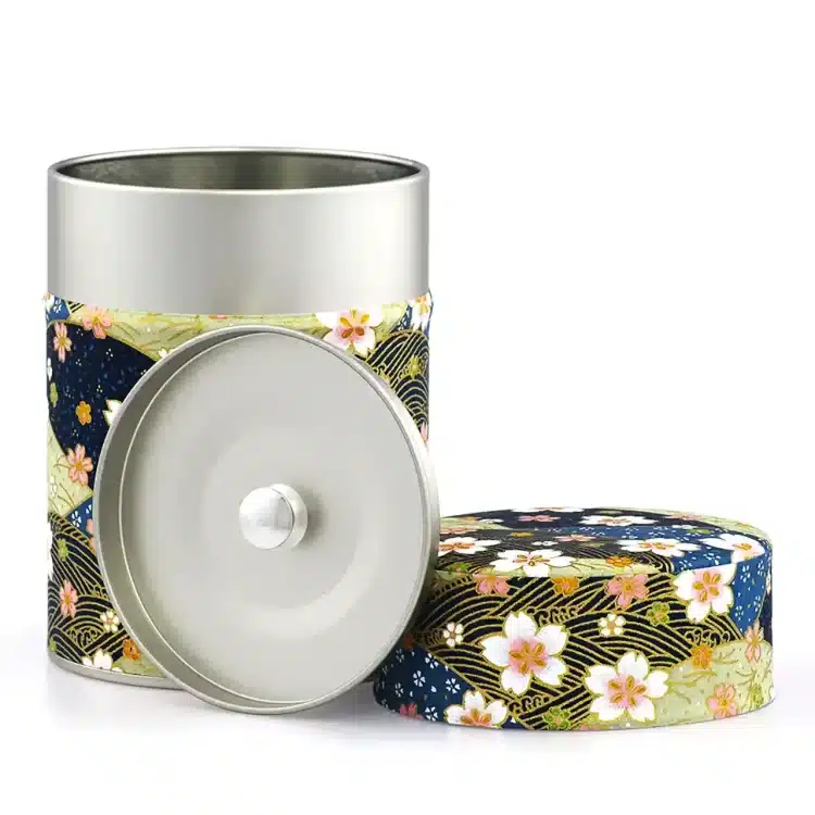 De theeblikken van Esprit Celadon die wij verkopen hebben allemaal dezelfde basis: een cilindervormig blik van 115 mm x Ø 83 mm met een dubbele deksel. Dat basisblik is door de Franse producent met veel aandacht voor detail voorzien van een washi papier of polymeer behangetje met een mooie print er op. De print loopt door op de zijkant van de overschuifdeksel. De bovenkant van deze deksel heeft om technische redenen een eigen uitsnede van de print, maar die hebben ze wel zoveel mogelijk in stijl doorgevoerd, zoals je op de foto’s kunt zien. Onder de overschuifdeksel bevindt zich de binnendeksel met een knopje, die de thee extra beschermt tegen invloeden van buitenaf.