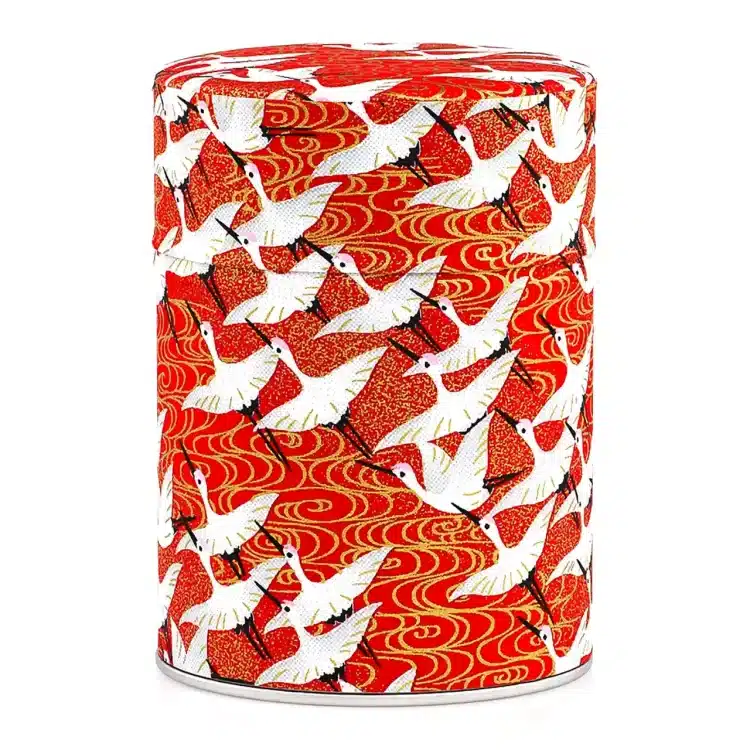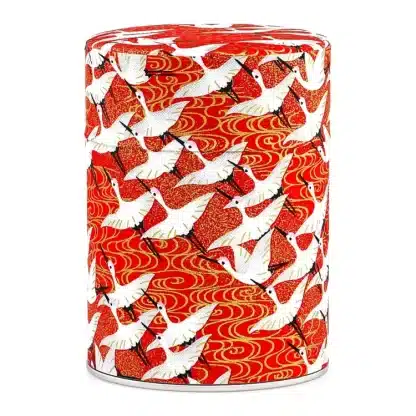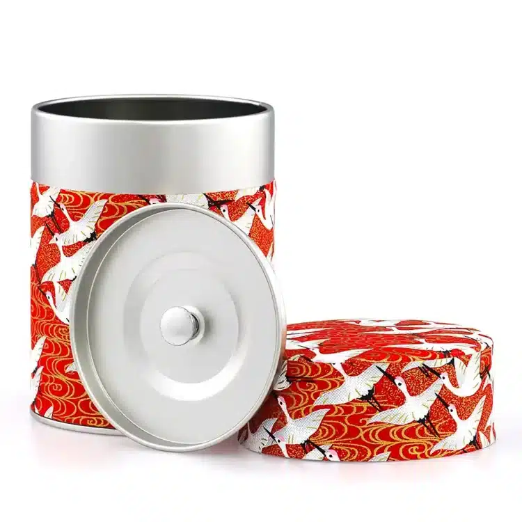 De theeblikken van Esprit Celadon die wij verkopen hebben allemaal dezelfde basis: een cilindervormig blik van 115 mm x Ø 83 mm met een dubbele deksel. Dat  basisblik is door de Franse producent met veel aandacht voor detail voorzien van een washi papier of polymeer behangetje met een mooie print er op. De print loopt door op de zijkant van de overschuifdeksel. De bovenkant van deze deksel heeft om technische redenen een eigen uitsnede van de print, maar die hebben ze wel zoveel mogelijk in stijl doorgevoerd, zoals je op de foto’s kunt zien. Onder de overschuifdeksel bevindt zich de binnendeksel  met een knopje, die de thee extra beschermt tegen invloeden van buitenaf.
