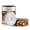 De theeblikken van Esprit Celadon die wij verkopen hebben allemaal dezelfde basis: een cilindervormig blik van 115 mm x Ø 83 mm met een dubbele deksel. Dat  basisblik is door de Franse producent met veel aandacht voor detail voorzien van een washi papier of polymeer behangetje met een mooie print er op. De print loopt door op de zijkant van de overschuifdeksel. De bovenkant van deze deksel heeft om technische redenen een eigen uitsnede van de print, maar die hebben ze wel zoveel mogelijk in stijl doorgevoerd, zoals je op de foto’s kunt zien. Onder de overschuifdeksel bevindt zich de binnendeksel  met een knopje, die de thee extra beschermt tegen invloeden van buitenaf.