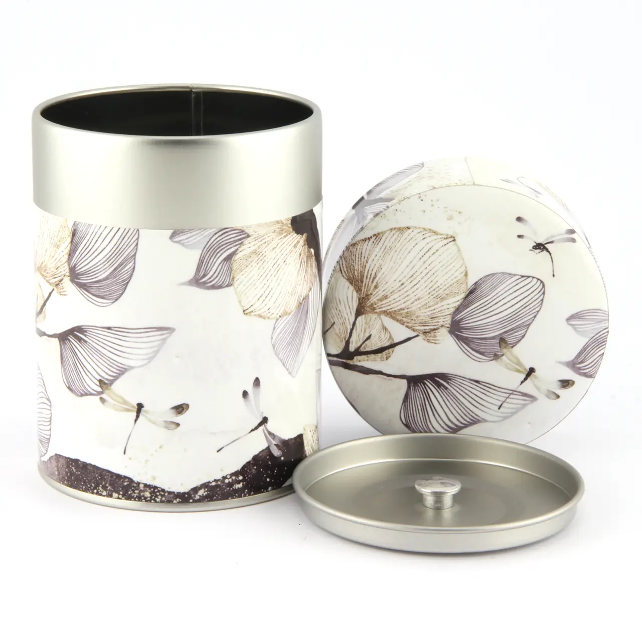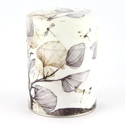 De theeblikken van Esprit Celadon die wij verkopen hebben allemaal dezelfde basis: een cilindervormig blik van 115 mm x Ø 83 mm met een dubbele deksel. Dat  basisblik is door de Franse producent met veel aandacht voor detail voorzien van een washi papier of polymeer behangetje met een mooie print er op. De print loopt door op de zijkant van de overschuifdeksel. De bovenkant van deze deksel heeft om technische redenen een eigen uitsnede van de print, maar die hebben ze wel zoveel mogelijk in stijl doorgevoerd, zoals je op de foto’s kunt zien. Onder de overschuifdeksel bevindt zich de binnendeksel  met een knopje, die de thee extra beschermt tegen invloeden van buitenaf.
