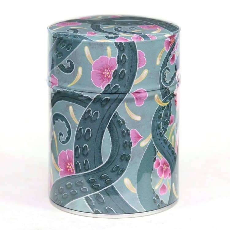 De theeblikken van Esprit Celadon die wij verkopen hebben allemaal dezelfde basis: een cilindervormig blik van 115 mm x Ø 83 mm met een dubbele deksel. Dat basisblik is door de Franse producent met veel aandacht voor detail voorzien van een washi papier of polymeer behangetje met een mooie print er op. De print loopt door op de zijkant van de overschuifdeksel. De bovenkant van deze deksel heeft om technische redenen een eigen uitsnede van de print, maar die hebben ze wel zoveel mogelijk in stijl doorgevoerd, zoals je op de foto’s kunt zien. Onder de overschuifdeksel bevindt zich de binnendeksel met een knopje, die de thee extra beschermt tegen invloeden van buitenaf.