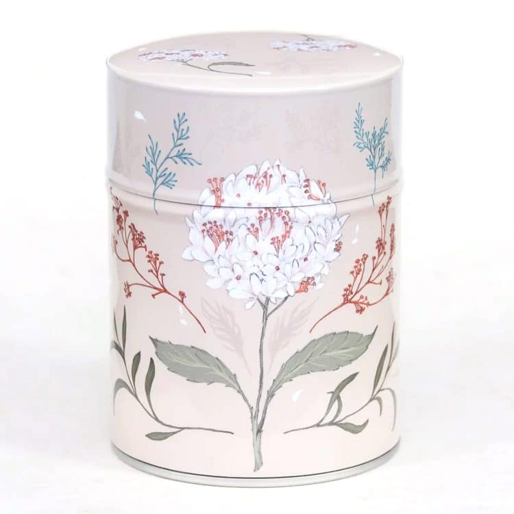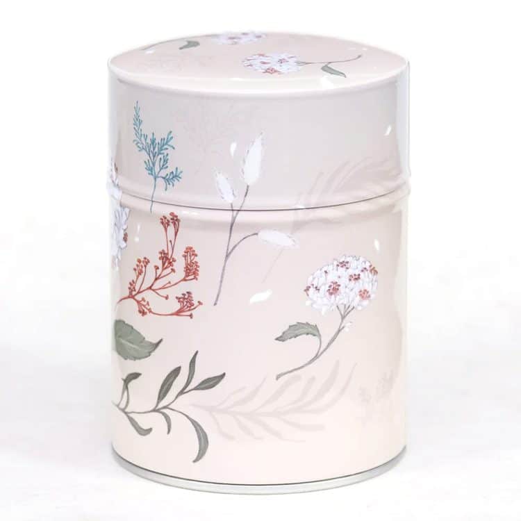 De theeblikken van Esprit Celadon die wij verkopen hebben allemaal dezelfde basis: een cilindervormig blik van 115 mm x Ø 83 mm met een dubbele deksel. Dat  basisblik is door de Franse producent met veel aandacht voor detail voorzien van een washi papier of polymeer behangetje met een mooie print er op. De print loopt door op de zijkant van de overschuifdeksel. De bovenkant van deze deksel heeft om technische redenen een eigen uitsnede van de print, maar die hebben ze wel zoveel mogelijk in stijl doorgevoerd, zoals je op de foto’s kunt zien. Onder de overschuifdeksel bevindt zich de binnendeksel  met een knopje, die de thee extra beschermt tegen invloeden van buitenaf.