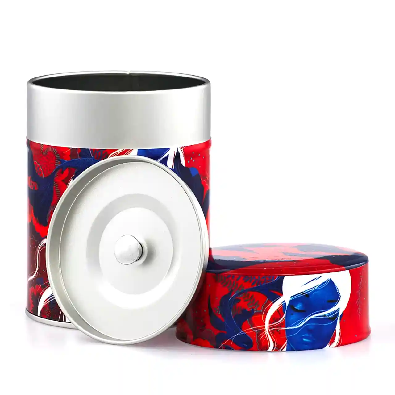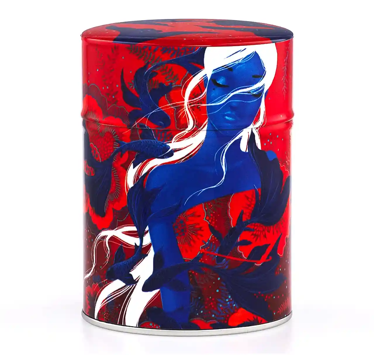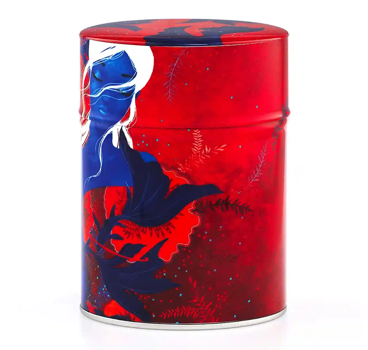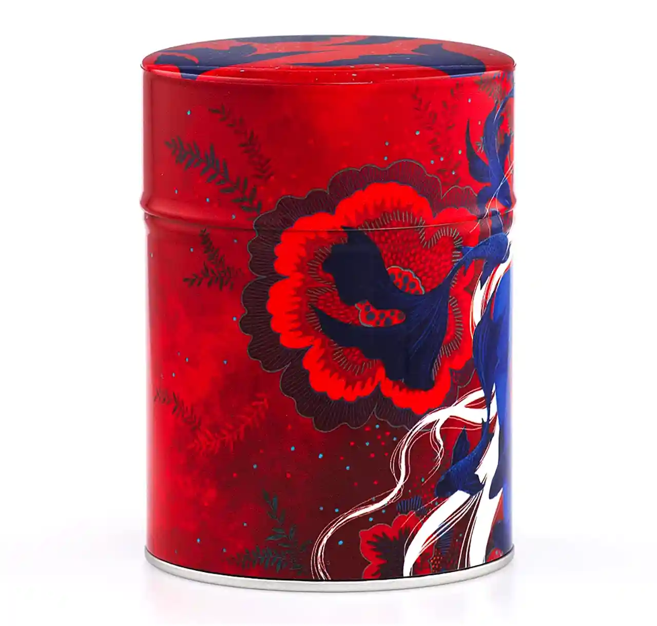 De theeblikken van Esprit Celadon die wij verkopen hebben allemaal dezelfde basis: een cilindervormig blik van 115 mm x Ø 83 mm met een dubbele deksel. Dat basisblik is door de Franse producent met veel aandacht voor detail voorzien van een washi papier of polymeer behangetje met een mooie print er op. De print loopt door op de zijkant van de overschuifdeksel. De bovenkant van deze deksel heeft om technische redenen een eigen uitsnede van de print, maar die hebben ze wel zoveel mogelijk in stijl doorgevoerd, zoals je op de foto’s kunt zien. Onder de overschuifdeksel bevindt zich de binnendeksel met een knopje, die de thee extra beschermt tegen invloeden van buitenaf.